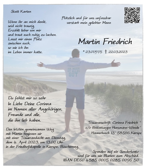 Liebe Corinna, ich wünsche Ihnen in dieser schweren Zeit alles Liebe und viel Kraft. Mein tiefes Mitgefühl gilt Ihnen und all denjenigen, die mit Ihnen verbunden sind.